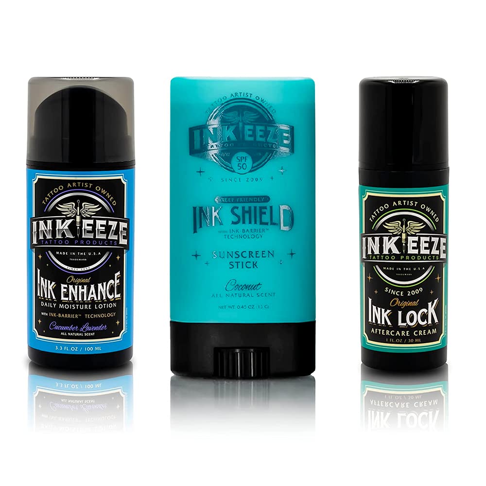 Amazon Com Ink Eeze Tattoo Aftercare Bundle Ink Lock Cream Sunscreen Stick Sunscreen Spray Moisturize And Protect Cruelty Free 50 Spf Made In Usa Beauty Personal Care